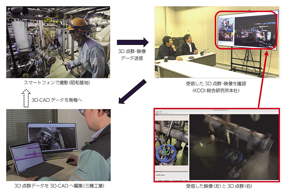 この実証実験では、スマートフォンでの設備の計測・撮影開始から、圧縮、伝送、日本側での受信とモニター表示まで、1秒以内の遅延で途切れなく3D点群データと映像を同期させて伝送できることを確認しました。また、受信した3D点群データは、3D-CAD(注3)で製図できる品質があり、南極での作業を支援できることを確認しました。さらに、設備の計測・撮影開始からデータの圧縮と伝送までを、3D点群圧縮伝送用ソフトウエアをインストールしたLiDAR搭載のスマートフォン1台で実行できることを確認しました。